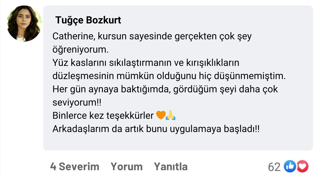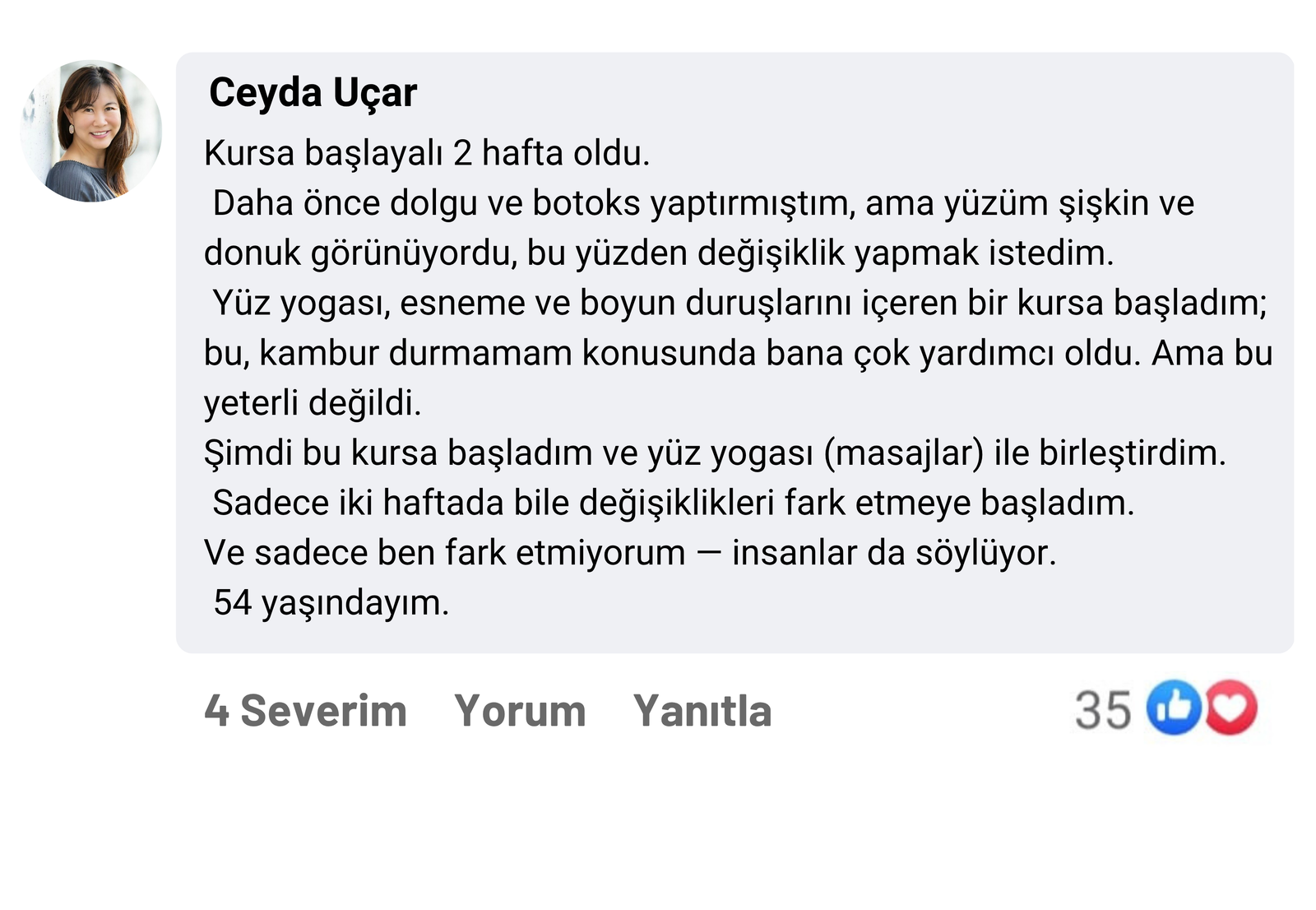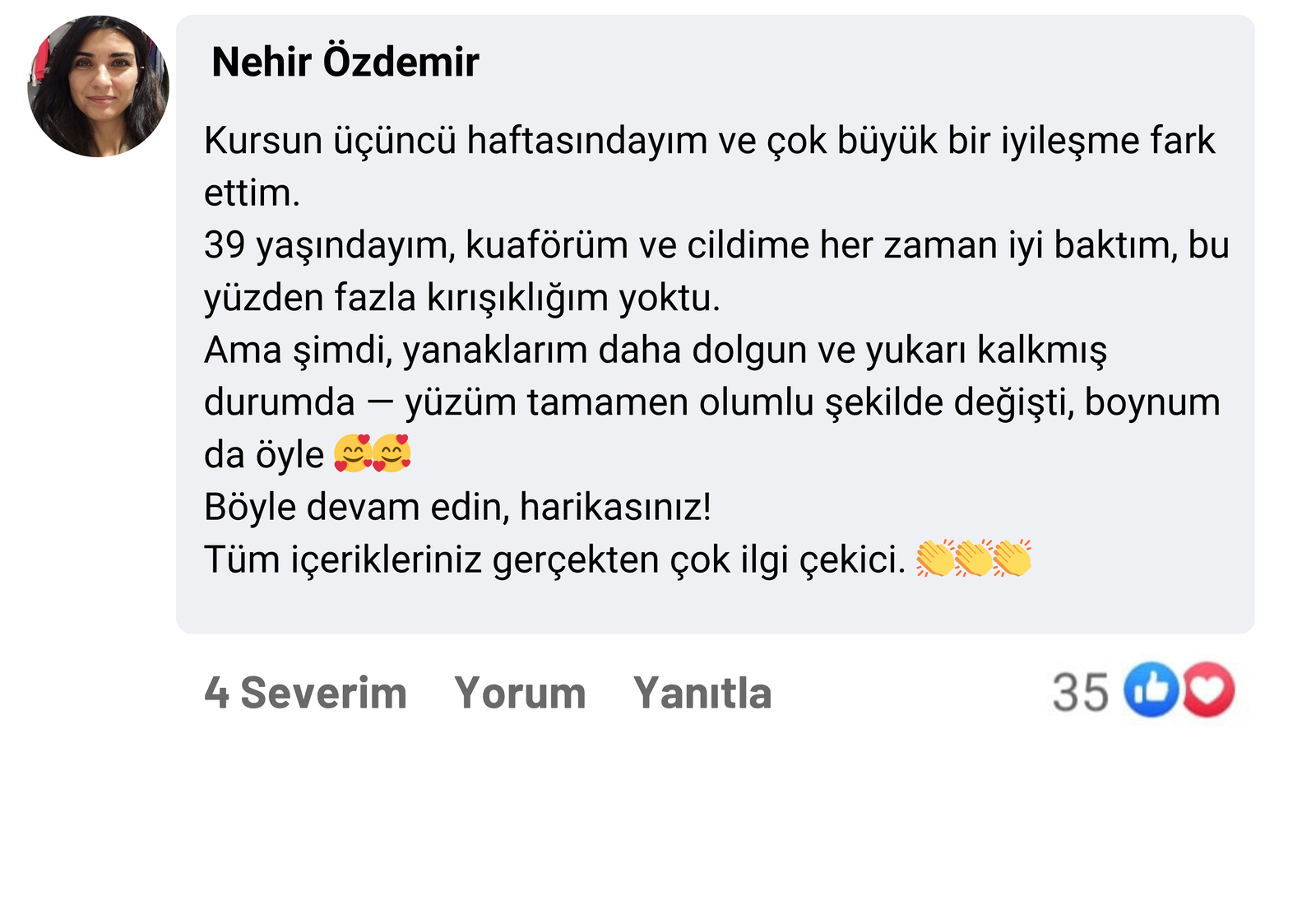 Çift çene, ifade çizgileri, nazolabial kıvrımlar ve koyu halkalar gibi belirli bölgeleri tedavi etmek için özel egzersizler öğreneceksiniz.