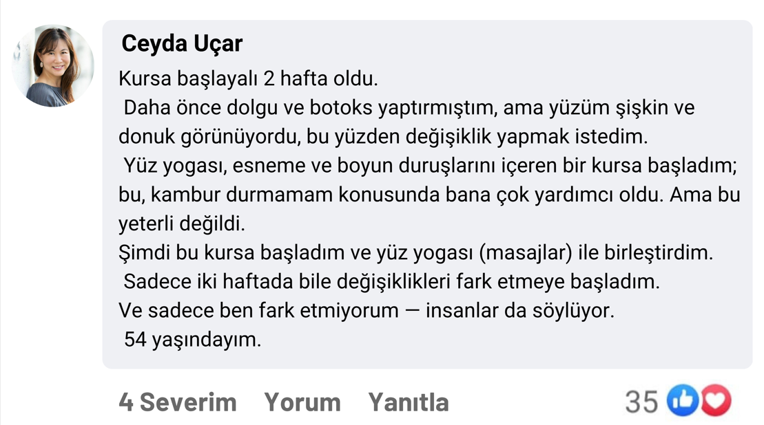 Dönüştürücü bir program yarattı; bu program direnç egzersizlerini, yüz masajlarını, lenf drenajını ve duygusal iyilik hâline bütüncül bir yaklaşımı birleştiriyor. Tecrübesi sayesinde, yüzlerini şekillendirmelerine, cilt sağlıklarını iyileştirmelerine ve özgüvenlerini artırmalarına yardımcı olarak yüzlerce kişiye gözle görülür ve kalıcı sonuçlar kazandırdı.