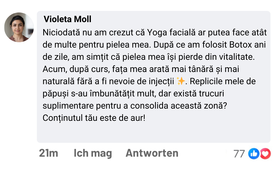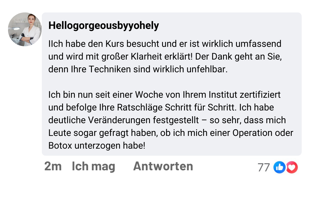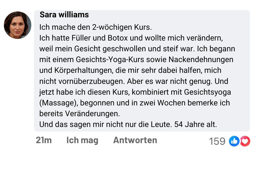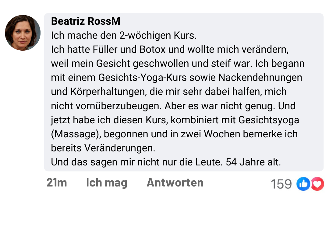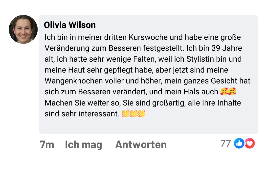 Nachdem ich unzählige Cremes ohne wirkliche Ergebnisse zur Beseitigung von Mimikfalten, Augenringen und Tränensäcken ausprobiert hatte, entdeckte ich, dass die Lösung nicht in teuren Produkten, sondern in natürlichen und wirksamen Methoden liegt. Diese Suche führte mich dazu, in Japan und Thailand zu reisen und dort zu trainieren, wo die wirkungsvollsten Gesichtsverjüngungstechniken ihren Ursprung haben.