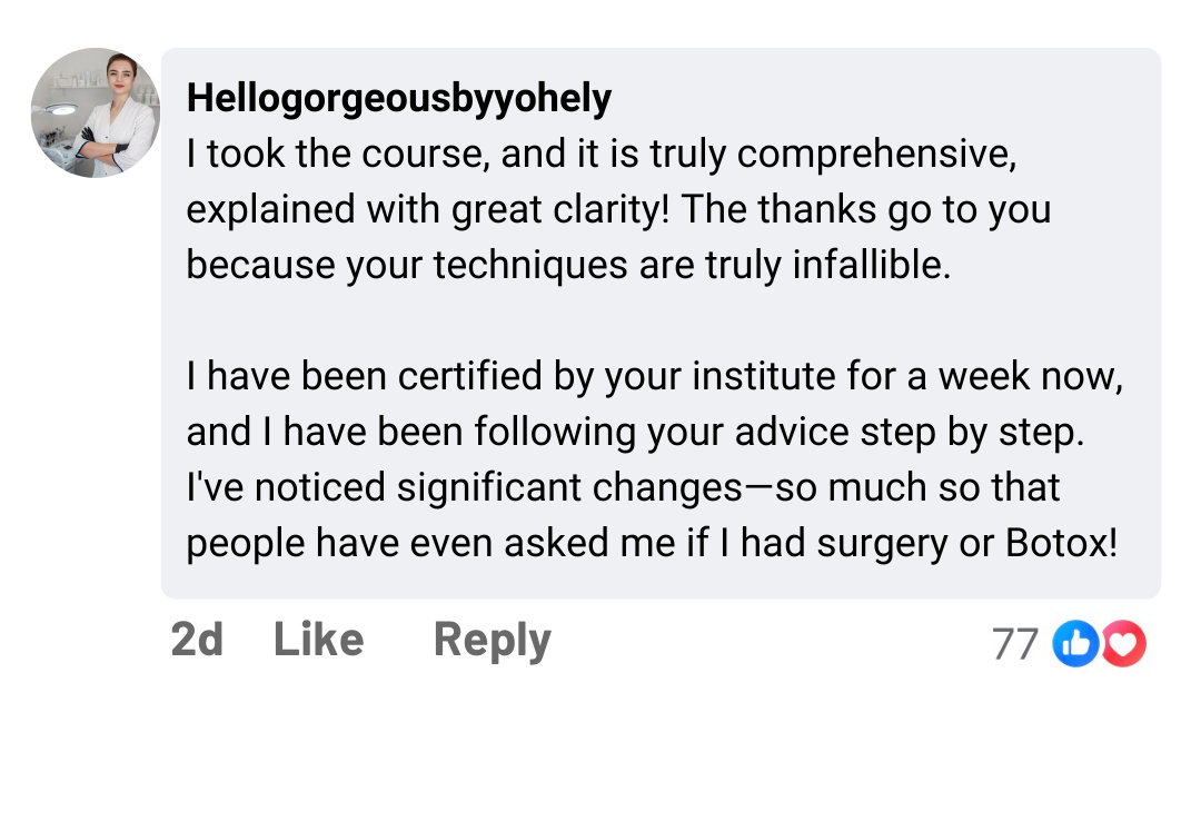 You will become an expert in natural facial rejuvenation, and if you wish, you will be able to develop a path to prosperity by offering your services, either in person or remotely (online), making a living from what you are so passionate about.