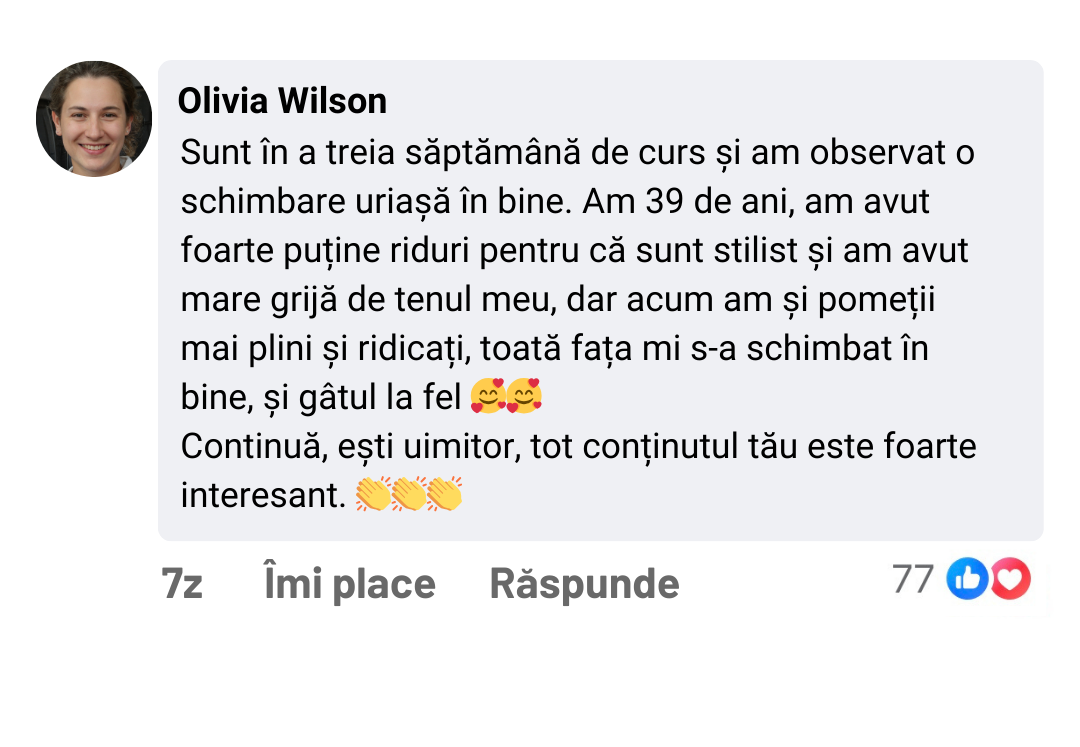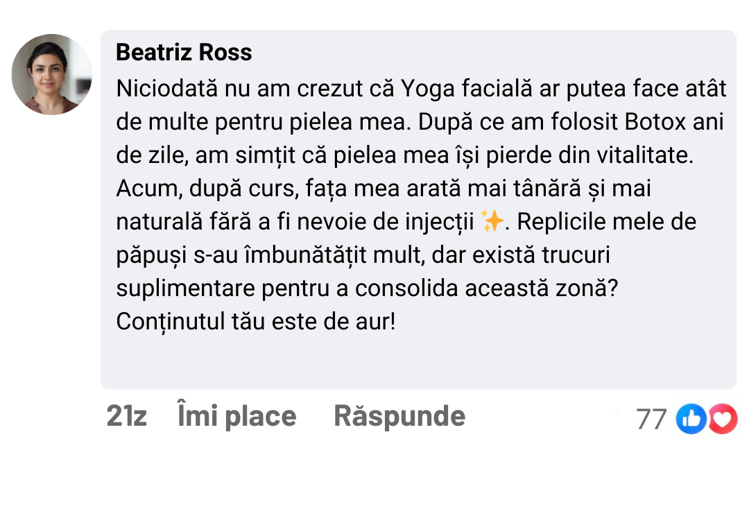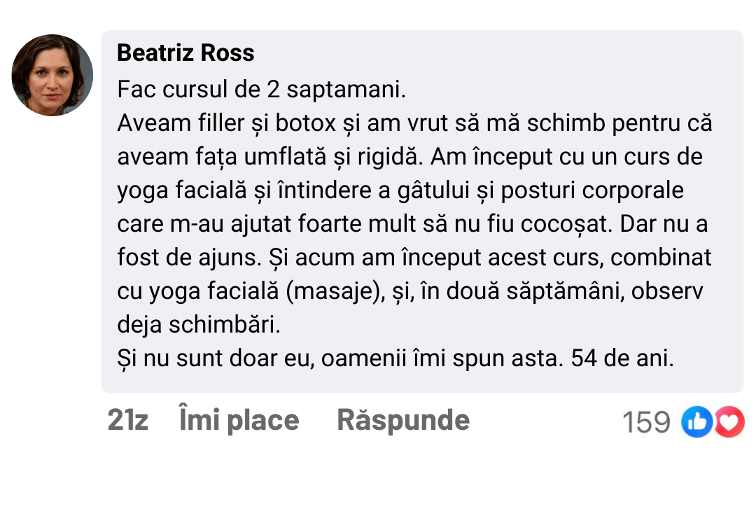 Fiecare exercițiu va fi explicat pas cu pas, permițându-vă să înțelegeți și să aplicați corect mișcările, concentrându-vă pe mușchii cheie ai feței.