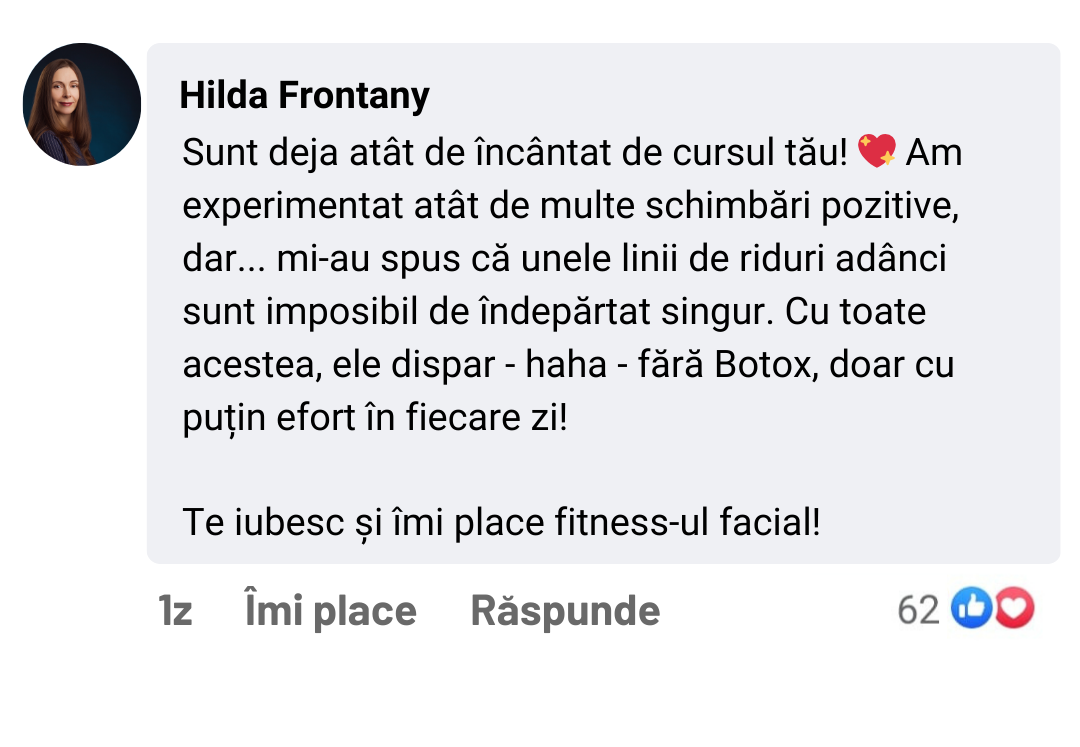 Exercițiile faciale întăresc mușchii de bază ai pielii. Prin tonifierea acestor mușchi, pielea căpătă fermitatea, reducând vizibil ridurile din zonele cheie precum fruntea, ochii și gura.